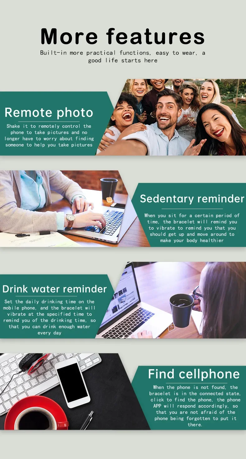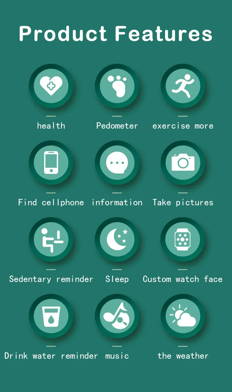Function: Passometer,fitness tracker,sleep tracker,Message Reminder,Call Reminder,REMOTE CONTROL,Push Message,24 hour instruction,Alarm Clock,World Time,week,Month,Heart Rate Tracker,Noctilucent,Calendar